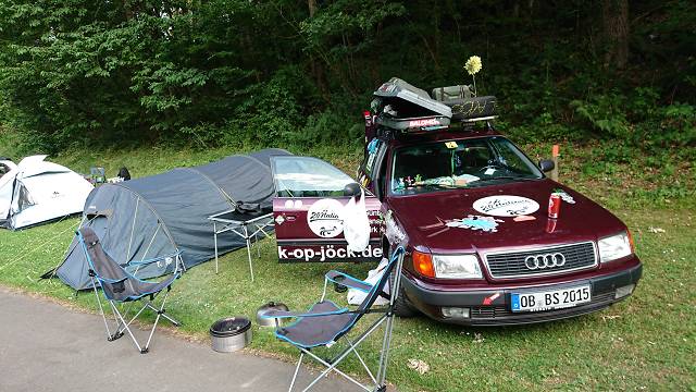 Der nächste Stop lag in Belgien bei Eben-Eter, wir mussten zu einem Turm, der komplett aus Feuersteinen gebaut wurde und auf dem Dach waren 4 Engel der Apokalypse, ziemlich bizarr das Ganze. Dort machten wir ein Selfie und begaben uns auf die letzte Etappe für den heutigen Tag. Ziel was Esch sur Sure in Luxemburg. Dort mussten wir noch eine Frage beantworten und bezogen dann unser Nachtquartier. Ein Campingplatz an einem kleinen Fluss. Wir waren eins der ersten Teams und so konnten wir in Ruhe aufbauen und zuschauen wie ein Team nach dem anderen eintrudelte.