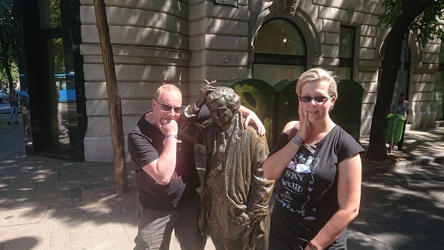 Als Tagesaufgabe sollten wir die Statue von Columbo finden und ein Foto mit ihr machen. Da wir gut in der Zeit lagen und sowieso einmal quer durch die Stadt mussten, um zum Campingplatz zu kommen, erledigten wir die Aufgabe gleich mit. Wir fanden einen kostenfreien Parkplatz irgendwo und liefen dann noch einige Meter bis zur Statue. Einen kleinen Abstecher an das Ufer der Donau machten wir auch, und konnten so einen guten Blick auf die andere Stadtseite ergattern.