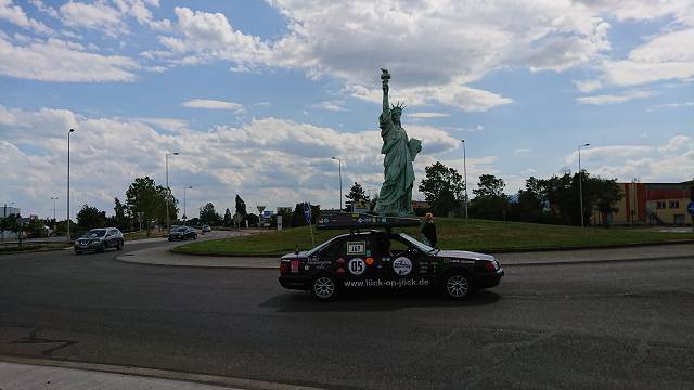 Am späten Nachmittag erreichten wir Colmar. Hier sollten wir die Freiheitsstatue finden. Der Erbauer kam ursprünglich aus Colmar und ihm zu Ehren steht auf einem Kreisel eine "Kleine" Freiheitsstatue. Im Roadbook stand wieder die Straße und so war die nächste Bushhaltestelle unsere, hier gab es glücklichweise wieder eine Straßenkarte und das finden der richtigen Straße war so doch recht einfach. Am Kreisel angekommen hüpfte Jana aus dem Auto und Dirk fuhr gemütlich ein paar Runden durch den Kreisel während Jana ein paar Bilder von Günti und der Statue machte.