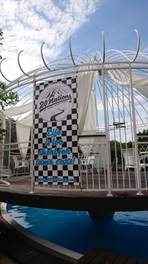 Kurz vorm Ziel trafen wir das Kortini Rally Team und so fuhren wir die letzten Meter zusammen. Wir sollten vor 17.30 Uhr am Campingplatz ankommen und das schafften wir auch. Etliche Teams waren schon angekommen und tummelten sich bereits im Pool. Wir tranken erstmal ein Bier, hielten etwas Schwätzchen und machten uns danach noch an die Arbeit. Wir mussten ja unser Zelt noch aufbauen und Günti verarzten. Von Team Uncle Benz Racing Team bekamen wir Auffahrrampen und so konnte sich Dirk ohne Probleme unter Günti legen und der Unterfahrschutz abmontieren.