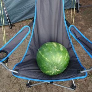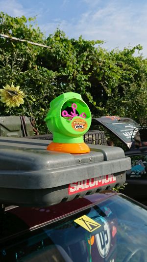 Stilecht bauten wir auch mal wieder unsere Seifenblasenmaschine auf und erfreuten so die anderen Teams sowie die anderen Gäste auf dem Campingplatz. Zwei kleine Mädchen waren besonders angetan. Wir schenkten den zwei noch kleine Seifenblasen von uns und so kamen wir mit der Mutter ins Gespräch. Die Familie kam aus Österreich und so war die Verständigung auch recht einfach. Wir schwatzten eine ganze Weile miteinander und erzählten von unseren Erlebnissen. Wir wünschten uns gegenseitig noch eine schöne Zeit und wir machten uns auf den Weg Richtung Pool zu den anderen. Dirk wollte dann doch noch eine Runde in den Pool hüpfen und ging zurück zum Auto um seine Badehose zu holen. Als er zurückkam zeigte er mir ein Foto mit einer riesigen Wassermelone, die auf einem unserer Stühle lag. Die Freude war groß und das Rätselraten begann. Welches Team hatte uns diese Melone geschenkt und vor allem warum ? Als erstes hatten wir das Kortini Rally Team in Verdacht. Sie verneinten glaubwürdig und so klapperten wir nacheinander die anderen Teams ab, aber kein will es gewesen sein. Zurück am Auto kam die Mutter der Familie vorbei und erzählte, dass sie uns die Melone geschenkt hat. Sie hatten selber 4 Stück bekommen und wussten nicht wohin damit. Wir bedankten uns herzlich und nahmen die Melone mit zur Party. Für uns alleine war sie viel zu groß und so viel Platz hatten wir im Kühlschrank dann auch nicht.