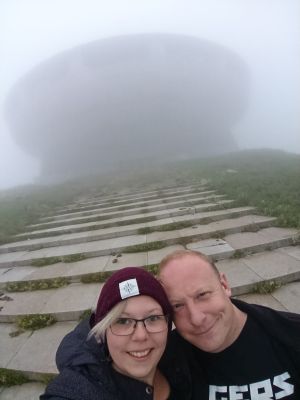 Laut Roodboak sollten wir das Denkmal schon von weitem sehen, aber die dicke Wolkenwand um das Gebirge ließ nicht einen Blick zu. Ziemlich spät kamen wir dann an. Auf dem Berg war das Wetter auch nicht besser und so mussten wir das Denkmal im Wolkennebel suchen. An den Fackelfäusten wären wir beinahe vorbeigefahren wenn auf der Straße nicht andere Teams gestanden hätten. Wir hielten an und machten fix Foto Nummer eins. Dann ging es weiter zu dem Denkmal, auch hier war der Weg ziemlich abenteuerlich.