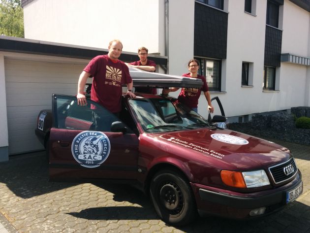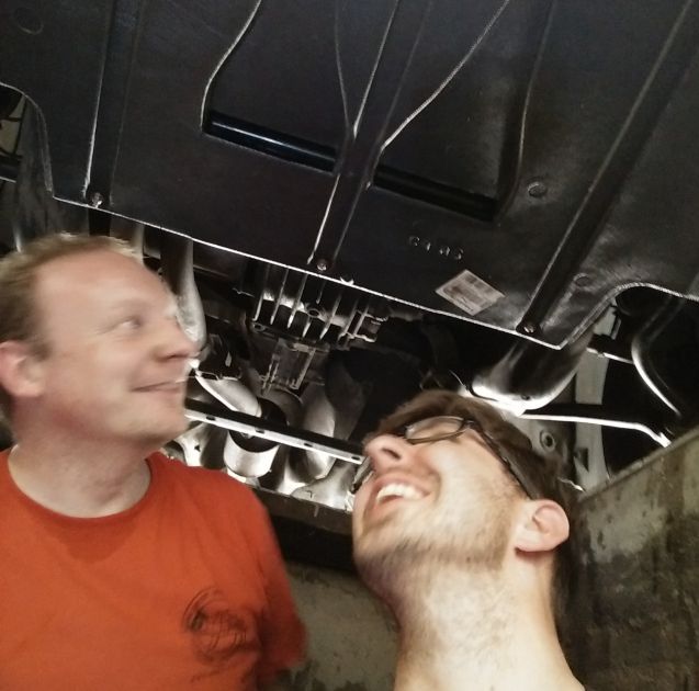 Im Anschluss haben wir mit viel Liebe und sehr viel Gefrickel den Unterfahrschutz an Günta angebracht. Auf dem Bild sieht man, dass wir zum Schluss sehr froh waren, als das Teil dann fest unter dem Auto angebracht war. Jetzt hoffen wir, das er seinen Job macht und uns auf der Tour vor größeren Steinschlägen von unten beschützen wird. |