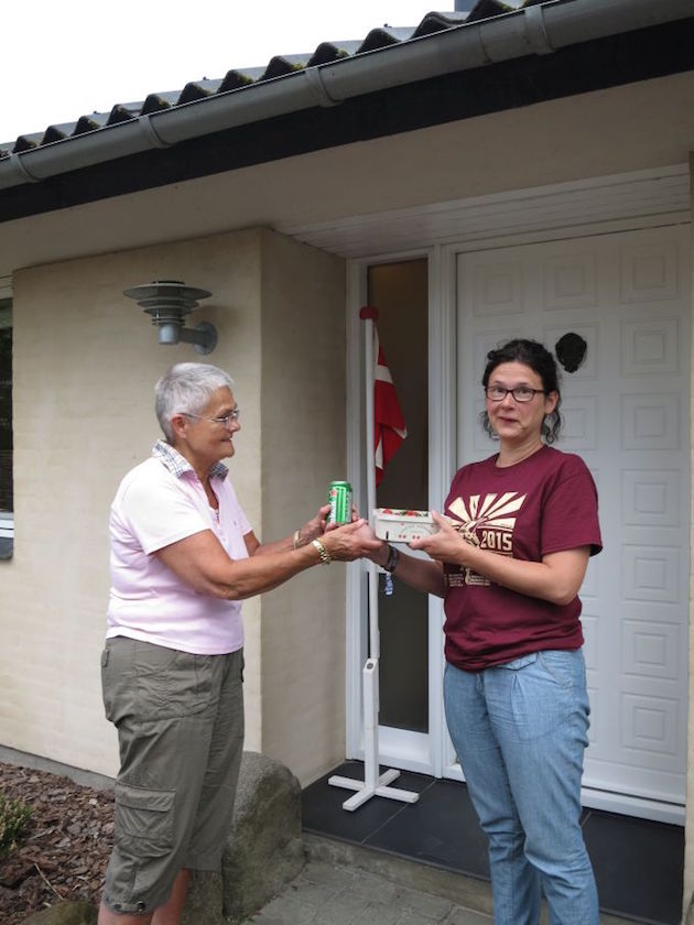 Dann war es endlich soweit, um 13 Uhr sind wir über die Startrampe gefahren. Jetzt sind wir "OP JÖCK". Da am ersten Tag die Benutzung von Autobahnen ausnahmsweise erlaubt ist, haben wir die in unsere Routenplanung aufgenommen und uns entschieden, nicht die Fähre ab Puttgarden zu nehmen, sondern die Strecke über Fünen zu fahren. Am Start wurde uns eine blaue Büroklammer überreicht, diese gilt es gegen einen anderen Gegenstand zu tauschen und dann im nächsten Land den erhaltenen Gegenstand wieder gegen einen anderen Gegenstand einzutauschen. Wichtig ist dabei, dass das Tauschgeschäft immer vor der Nationalflagge des Landes in dem wir uns gerade befinden durchgeführt wird. Wir haben die Hoffnung nach zehn Tauschgeschäften einen schönen Gegenstand mit nach Hause bringen zu können. In Deutschland haben wir die Büroklammer mit einem Paar aus dem Kreis Borken gegen eine Dose Heineken Bier getauscht. Gut, dass wir die Deutschlandfahne auf dem Auto haben und den ersten Tauschhandel so schnell durchführen konnten. In Dänemark haben wir in Solrod Strand einen Halt eingelegt, weil wir hier am Strand für eine weitere Aufgabe Sand sammeln wollten. Dazu kommen wir später. An einem Haus hing die Nationalflagge von Dänemark. Also haben wir angehalten und geklingelt. Und mit der netten Familie unseren zweiten Tausch vollzogen. |