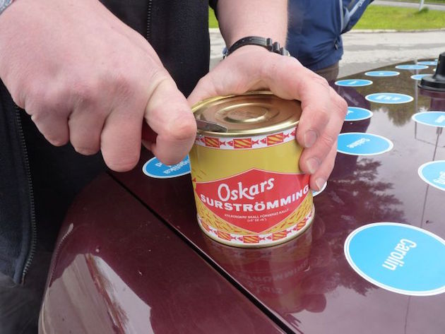 Diesmal war es umgekehrt. Bei trockenem Wetter ins Bett, bei Regen aus dem Bett. Nach einer warmen Dusche haben wir in einer Küche auf dem Campingplatz im Warmen gefrühstückt. Für die heutige Tagesaufgabe mussten wir die schwedische Spezialität Surstömming, vergorene Fische in der Dose, 200 km geöffnet im Auto transportieren. Beim Öffnen der Dose ist Dirk die ekelhafte Sauce ins Gesicht und aufs Auto gespritzt. Sehr lecker... Gut, dass wir die Einmalwaschlappen dabei haben. |