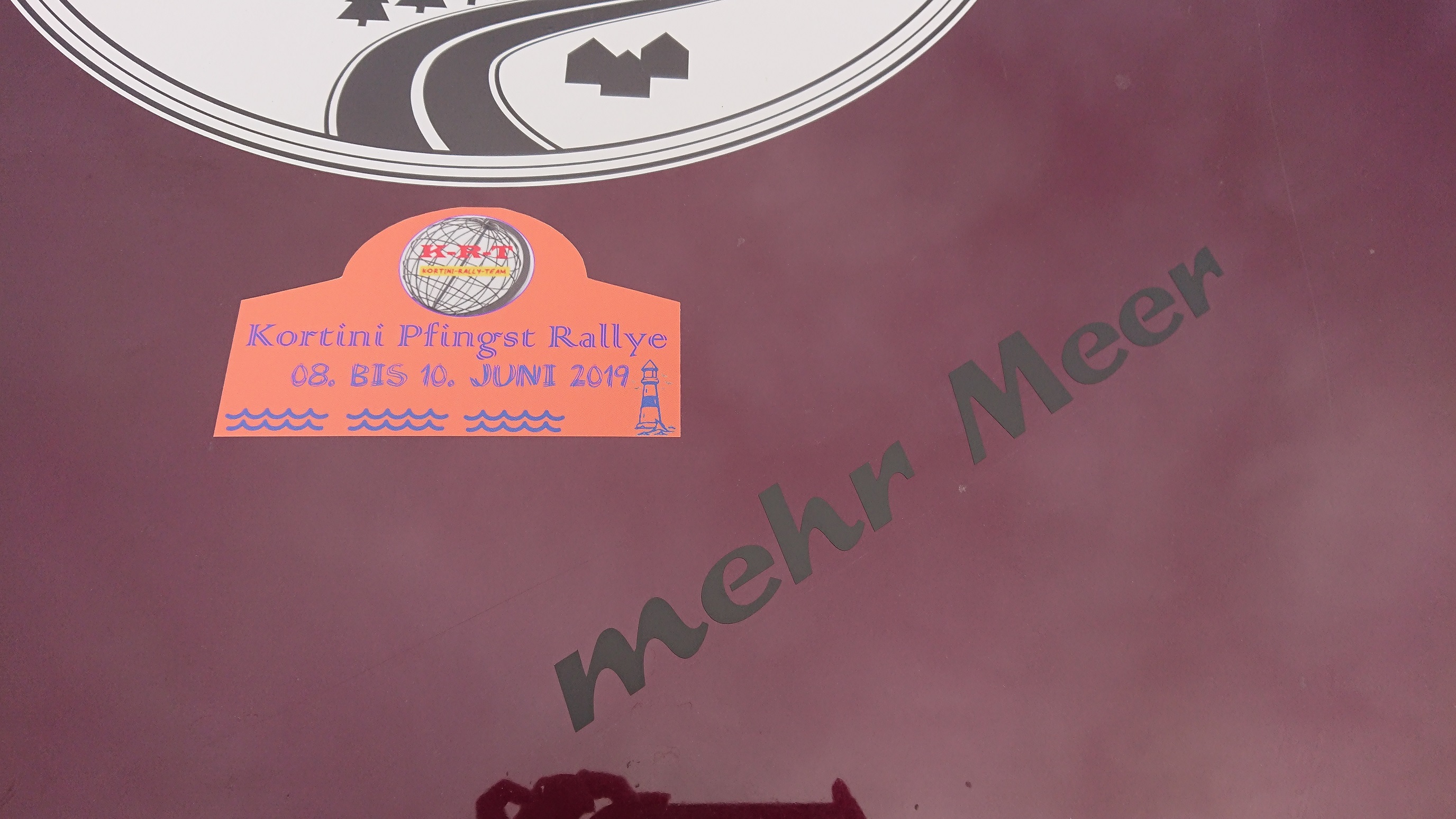 Nach einem groben Blick ins Roadbook haben wir Günti noch mit den Rallyeaufklebern verschönert – gar nicht so einfach bei dem Wind.